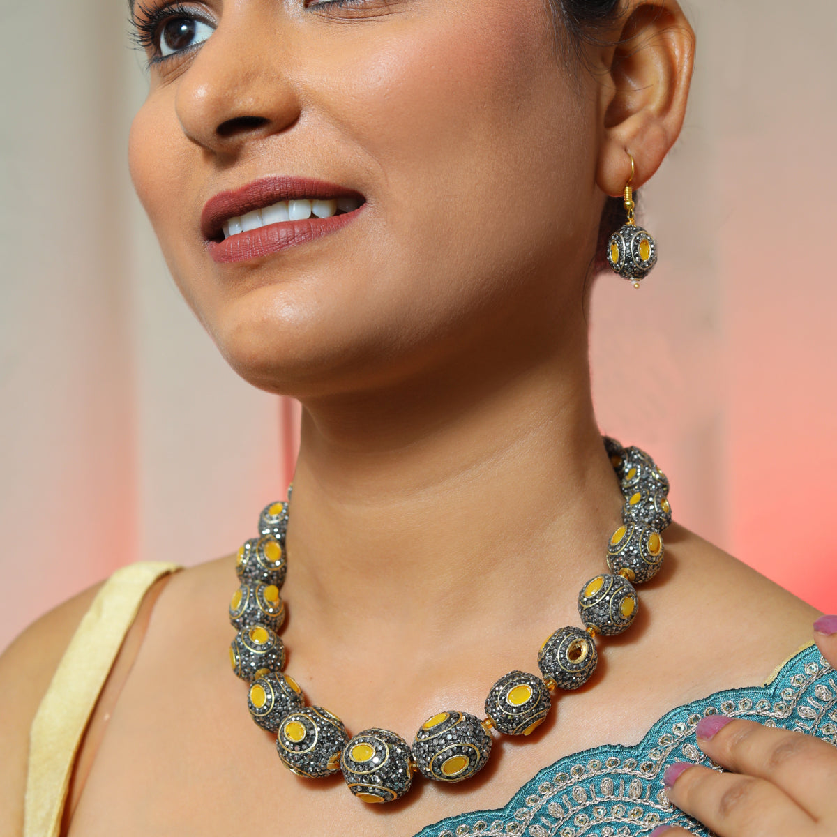 Elevate your ethnic ensemble with the Antique Grace Beaded Jewelry Set, a stunning combination of tradition and elegance. This exquisite set includes a necklace and matching earrings, featuring meticulously crafted spherical beads with antique silver-tone metalwork and golden-yellow embedded stones.