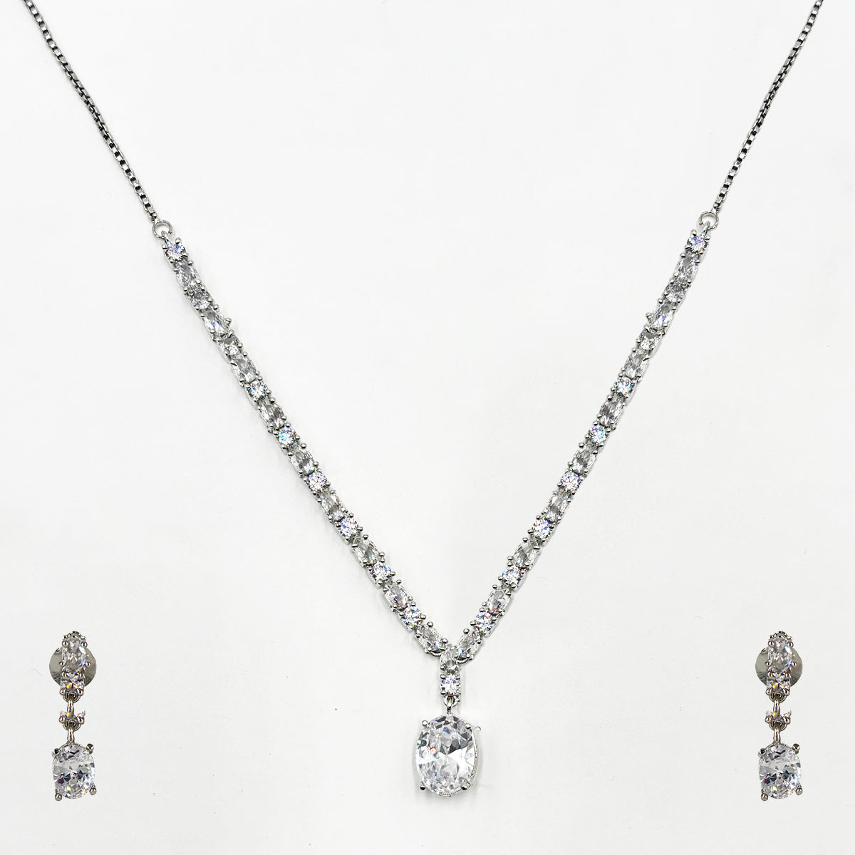 This elegant jewelry set features a beautifully designed silver-plated necklace with matching earrings, embellished with high-quality clear cubic zirconia stones. The necklace showcases a stunning oval-cut centerpiece that sparkles brilliantly, creating a timeless and sophisticated look. Perfect for weddings, receptions, parties, and festive occasions, this set adds a touch of glamour to any outfit.