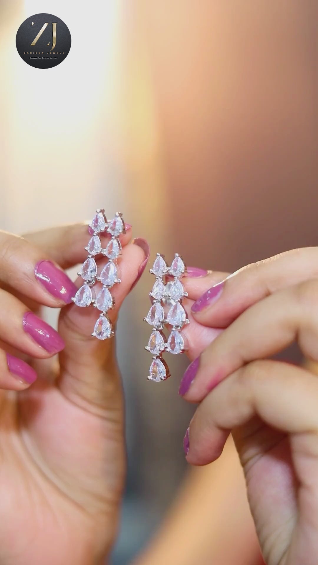 This luxurious silver-tone set features a double-layered necklace with sparkling square stones and delicate floral clusters. The matching long earrings complete this set, making it perfect for bridal or grand formal wear.