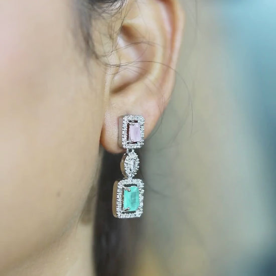 Add a refined touch of vintage glamour to your ensemble with the Vintage Elegance jewelry set. This striking set features a bold, symmetrical necklace adorned with alternating pastel pink and aqua green emerald-cut stones, each framed by intricate crystal halos for a brilliant finish. The necklace's focal point—a graceful drop pendant—adds a regal charm to the design, while the matching earrings echo the same double-gemstone motif, cascading into a radiant dangle that catches the light with every movement. Timeless and sophisticated, this set is perfect for weddings, formal galas, or special occasions where elegance is essential.
