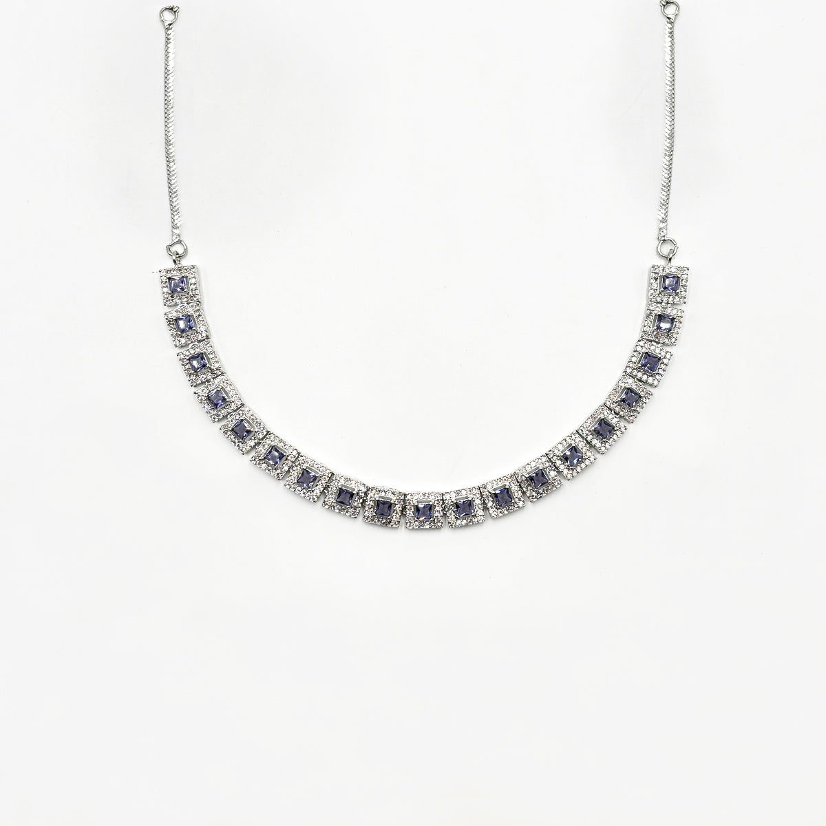 This elegant amethyst set features a classic choker necklace with radiant square-cut purple stones beautifully framed by clear zircons. The long dangle earrings complete this set, making it a luxurious choice for special events.