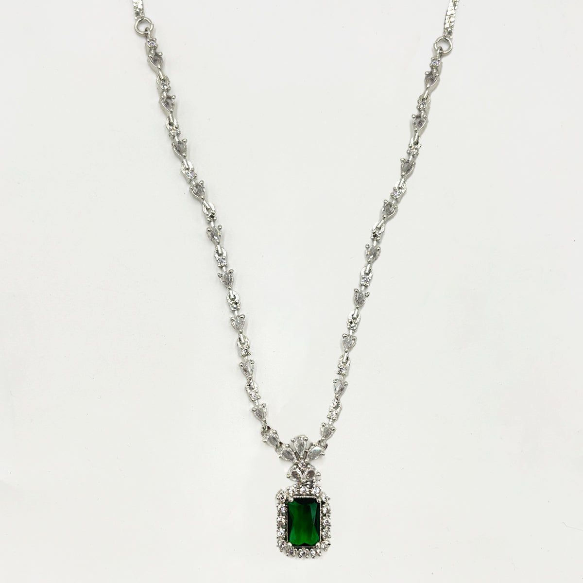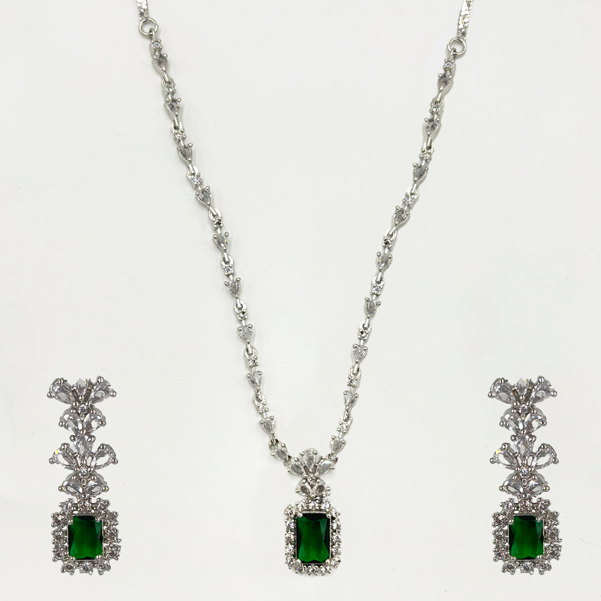 This regal emerald green set features a delicate vine-style necklace of brilliant zircons leading to a striking rectangular center pendant. The luxurious matching dangle earrings make this set an ideal choice for formal occasions.