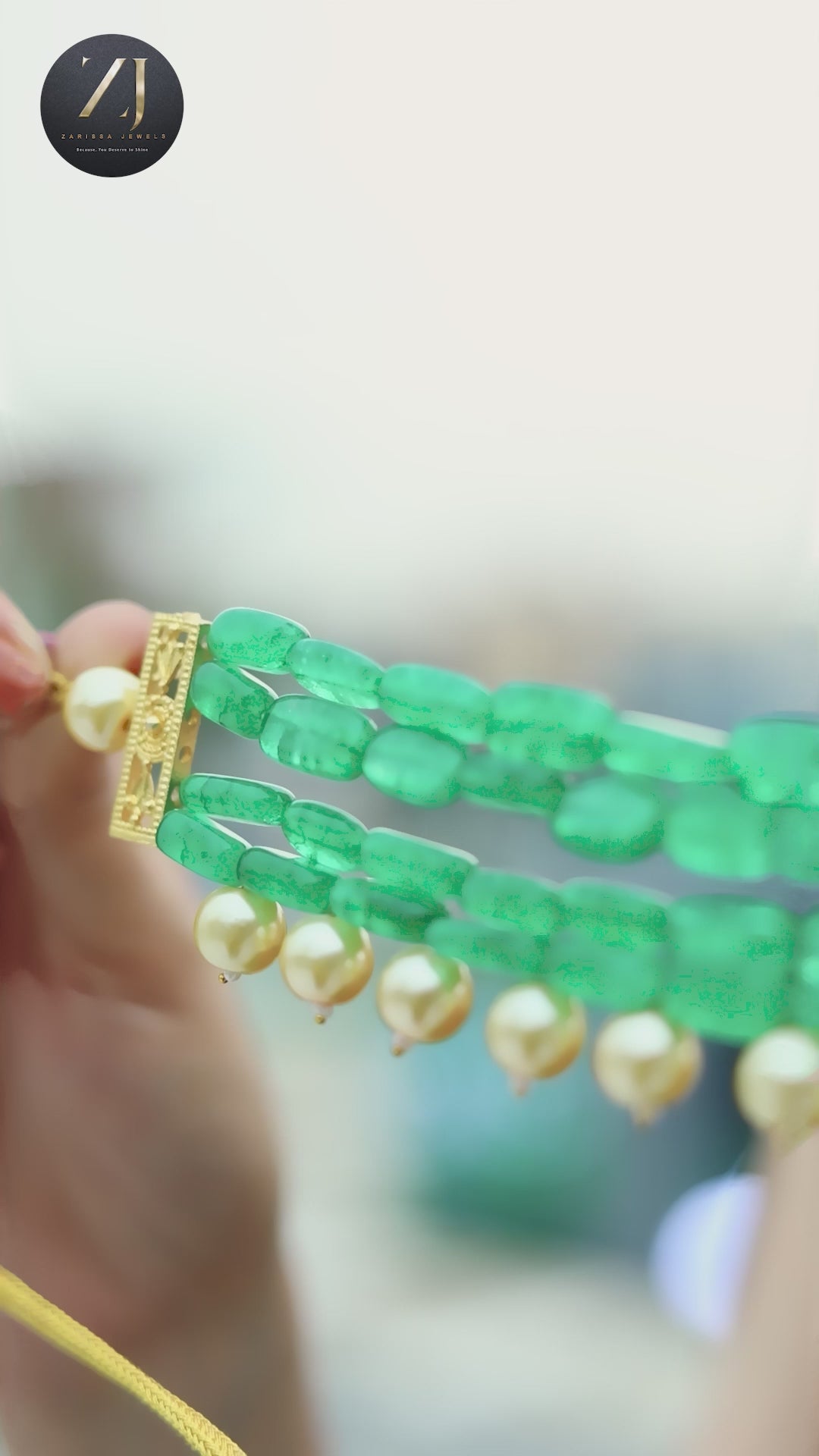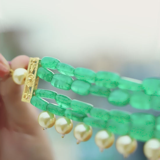 • Material: Green beads, faux pearls, gold-toned metal