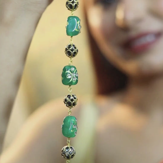 This charming Kundan jewelry set features a necklace and matching earrings, designed with a stunning combination of green beads and intricate floral detailing. The necklace is made up of green stones, each beautifully embellished with white and golden floral patterns, set in a gold-plated design that adds a rich, traditional touch. The matching earrings echo the same floral design and feature green stone accents, creating a harmonious and elegant look. Perfect for festive occasions or cultural events, this set exudes timeless beauty and will effortlessly elevate your attire.