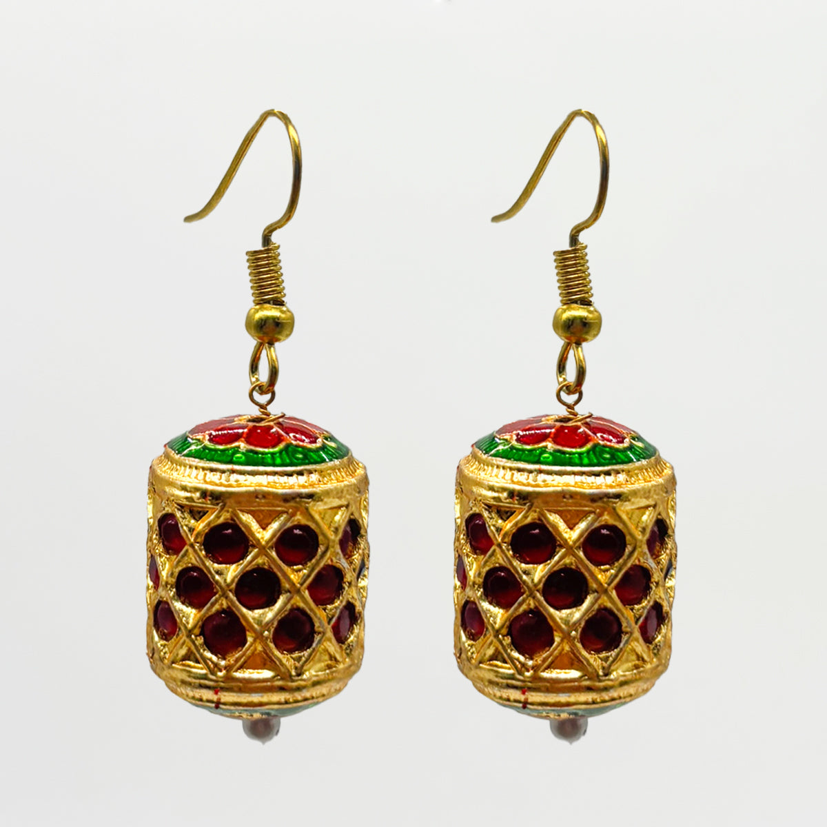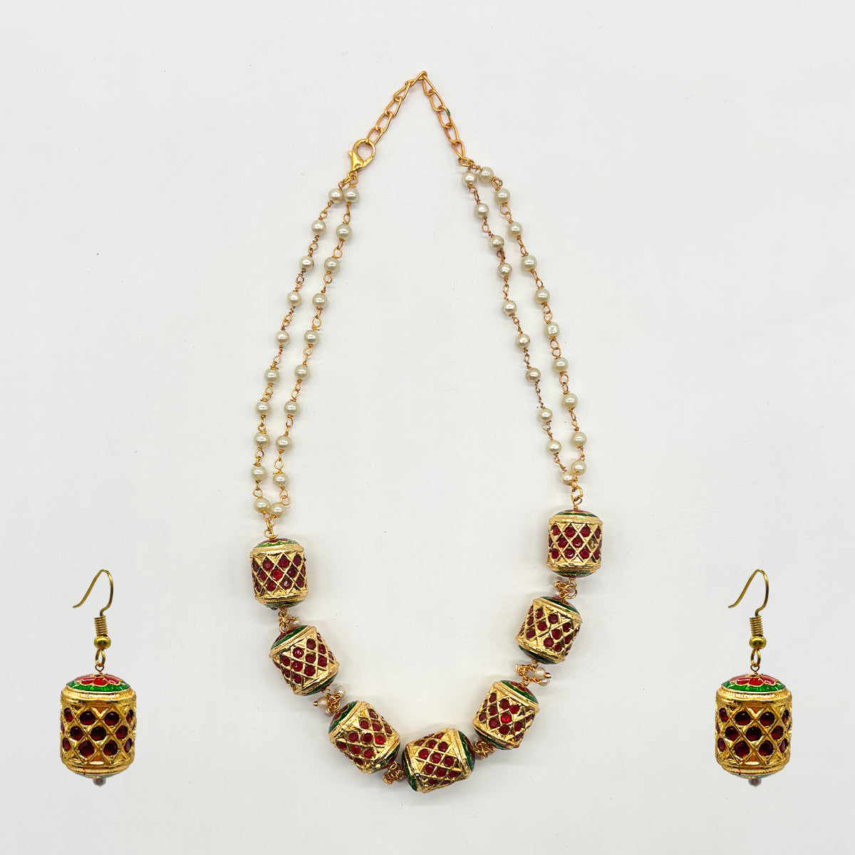 This exquisite ethnic necklace features a delicate pearl chain adorned with intricately crafted gold-tone barrel beads in rich red and green enamel. The matching drop earrings complete this traditional set, making it perfect for festive and wedding celebrations.