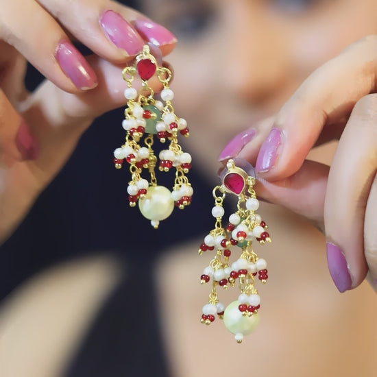 This charming handcrafted choker features light pink cabochon beads accented with ruby red and emerald green teardrop stones. Dainty pearl fringe drops add movement, making this set perfect for festive and wedding events.