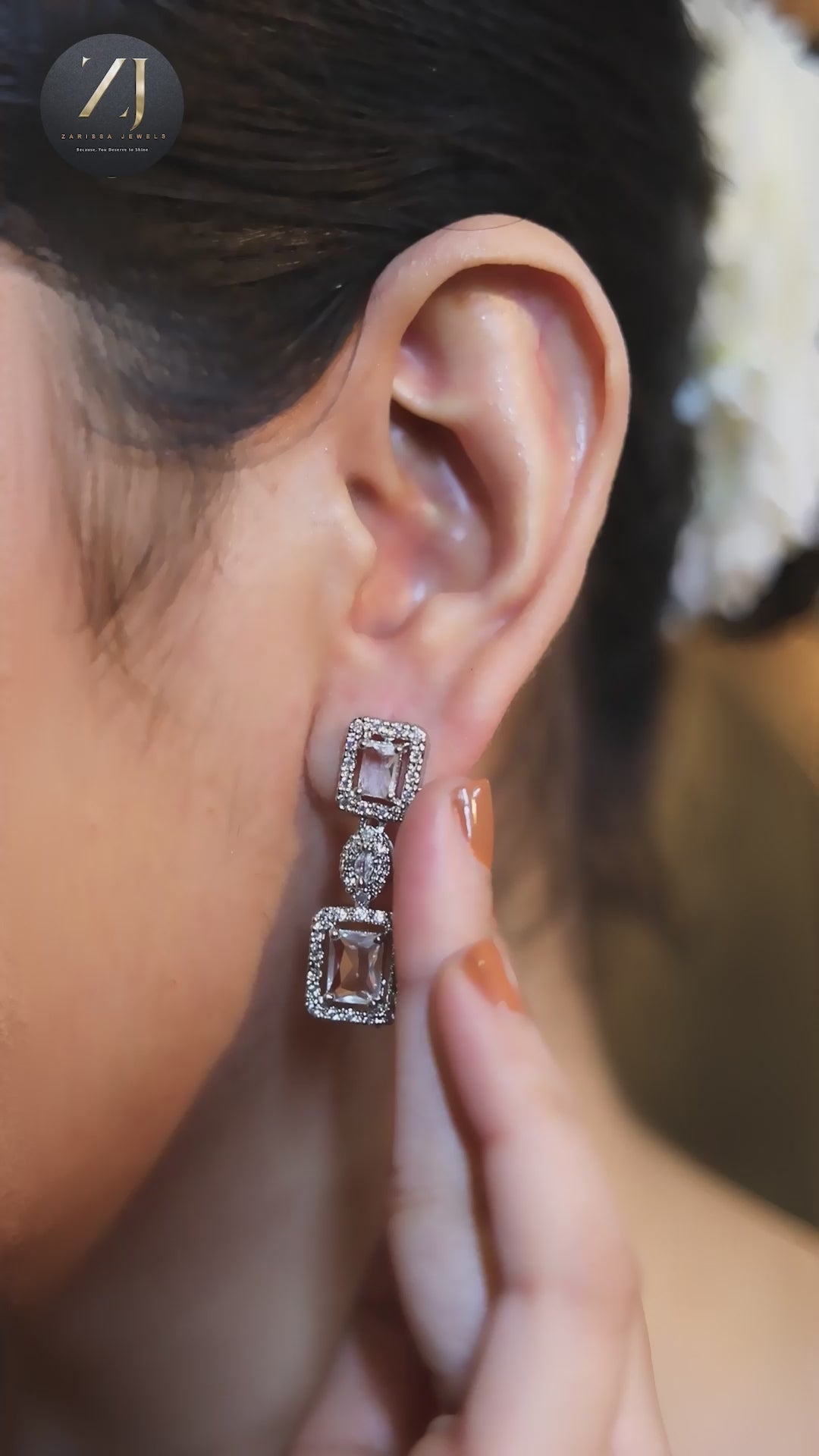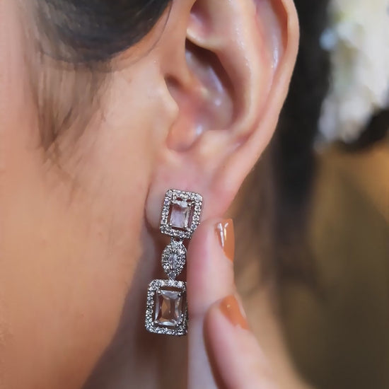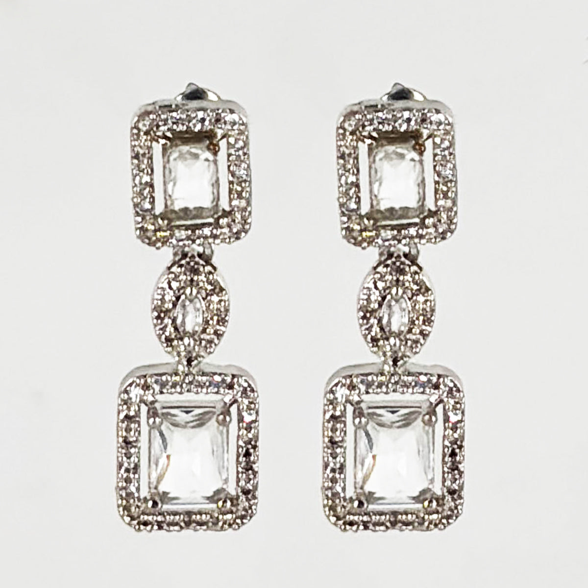 Elevate your elegance with the Regal Radiance jewelry set, featuring a stunning silver-plated necklace and matching drop earrings. Each piece showcases intricately faceted rectangular clear stones set in vintage-style frames, creating a timeless look of sophistication. The necklace is designed with a graceful curve of linked stones and a central pendant drop for added charm, while the matching earrings echo the design for a coordinated, polished finish. Perfect for weddings, evening events, or any special occasion where you want to shine.