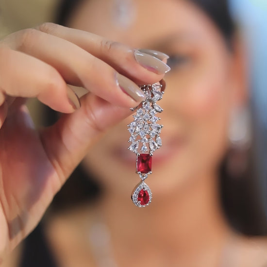 Make a royal statement with this exquisite jewelry set featuring a dazzling silver-plated necklace, matching earrings, and maang tikka. The centerpiece showcases a deep red gemstone framed with sparkling cubic zirconia, exuding elegance and grace. The intricate craftsmanship and luxurious shine make this set perfect for weddings, festive occasions, and traditional celebrations. Designed to add timeless beauty to your ethnic or fusion attire.