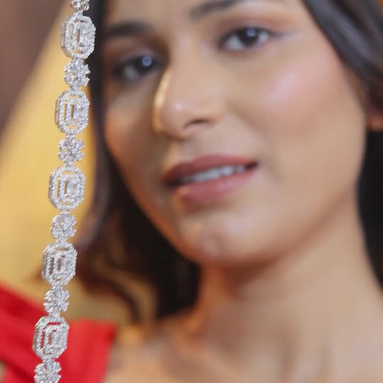 Shine with timeless elegance in this exquisite silver-plated necklace set. Crafted with sparkling diamond-cut stones arranged in floral and geometric patterns, this jewelry set is designed to bring a luxurious touch to your look. The necklace is paired with matching long drop earrings, adding extra glamour and sophistication. Perfect for weddings, receptions, parties, or festive occasions, this set is a must-have for women who love classy and contemporary designs.