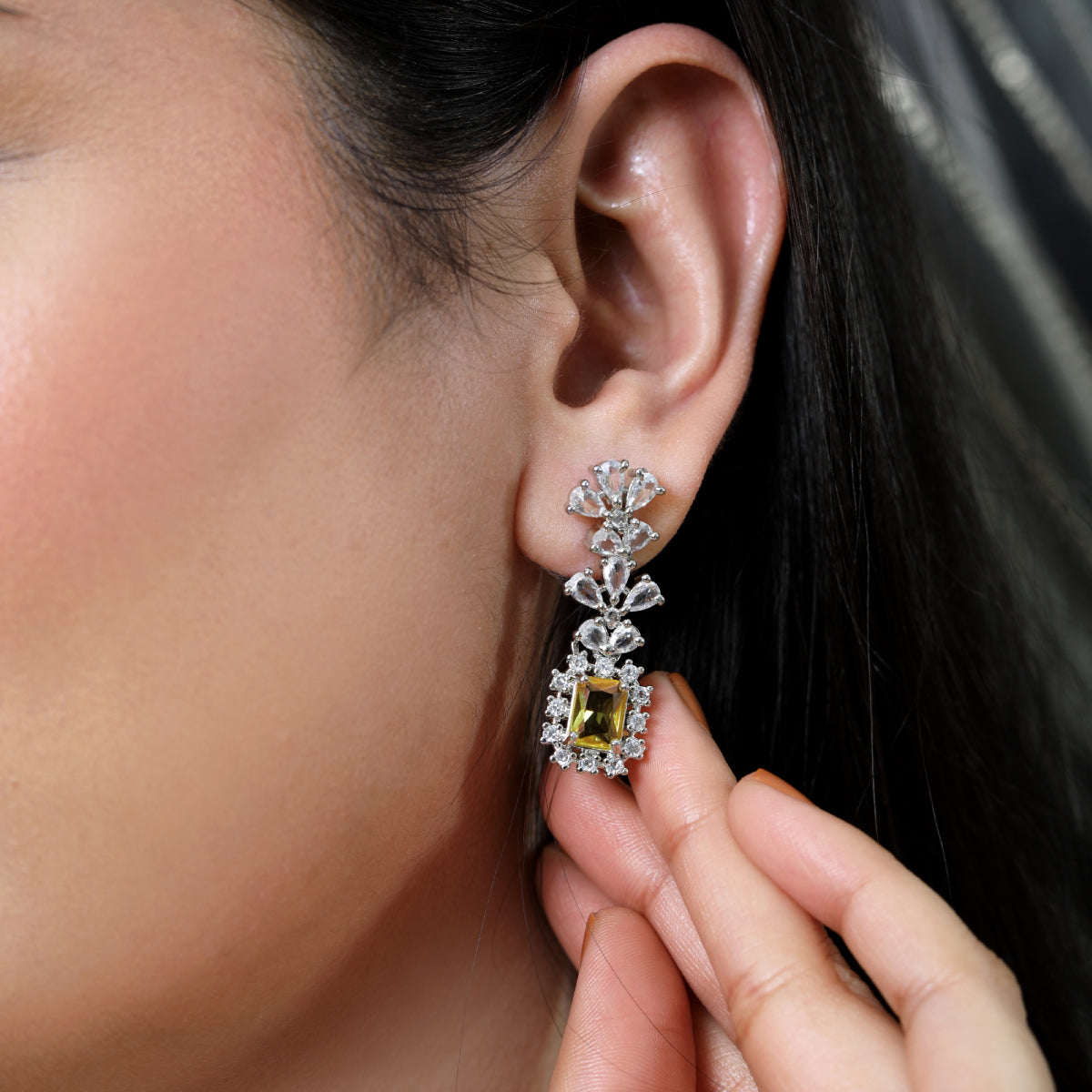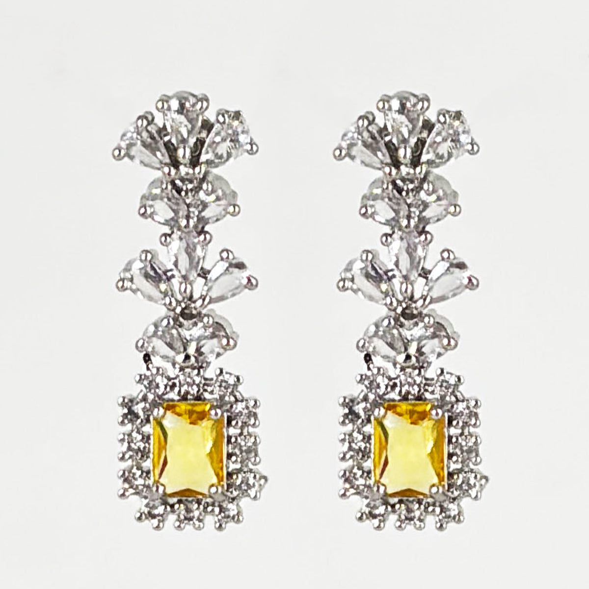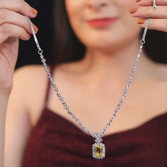 Add radiant charm to your style with this stunning necklace set featuring a brilliant yellow rectangular stone at the center, bordered with sparkling white crystals. The elegant silver-plated chain is delicately studded with shimmering stones, creating a luxurious appeal. Paired with matching earrings showcasing the same yellow centerpiece and crystal embellishments, this set is perfect for festive occasions, parties, or evening gatherings. Its modern yet timeless design makes it a versatile addition to your jewelry collection.