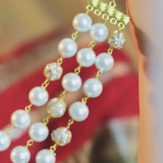 This elegant three-strand necklace features luminous ivory pearls interspersed with sparkling gold-tone zircon balls. The matching long dangle earrings complete this beautiful set, making it ideal for bridal or festive occasions.